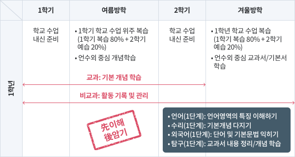 ¿¹½Àº¸´Ù´Â º¹½À À§ÁÖ·Î °øºÎÇØ¾ß ÇÕ´Ï´Ù. ±³°ú ¹× ¼ö´ÉÀº ¾ð¼ö¿Ü Áß½ÉÀÇ ±âº»¼ ÇнÀÀÌ ÀÌ·ç¾îÁ®¾ß ÇÕ´Ï´Ù. ¿µ¿ªº°·Î »ìÆìº¸¸é ¾ð¾î´Â ¹®Á¦À¯Çü ÆÄ¾Ç ¹× µ¶ÇØ·ÂÀ» ³ôÀÌ´Â µ¥ ÁÖ·ÂÇϰí, ¼ö¸®´Â ¹®Á¦À¯Çü ÆÄ¾Ç ¹× ºÐ¼®·ÂÀ» Çâ»ó½Ã۴µ¥ ÁÖ·ÂÇØ¾ß ÇÕ´Ï´Ù ±×¸®°í ¿Ü±¹¾î´Â µ¶ÇØ ¹× ¸®½º´× ½Ç·ÂÀ» Ű¿ìµµ·Ï Çϰí, ޱ¸´Â °³³ä¿Ï¼º°ú ±âº»¹®Á¦ Ç®ÀÌ¿¡ ÁßÁ¡À» µÎ¾î¾ß ÇÕ´Ï´Ù. ±×¸®°í ÀÌ ½Ã±â¿¡ ºñ±³°ú´Â 1Çг⠶§¿Í ¸¶Âù°¡Áö·Î Ȱµ¿±â·Ï ¹× °ü¸®¿¡ ÁýÁßÇØ¾ß ÇÕ´Ï´Ù.