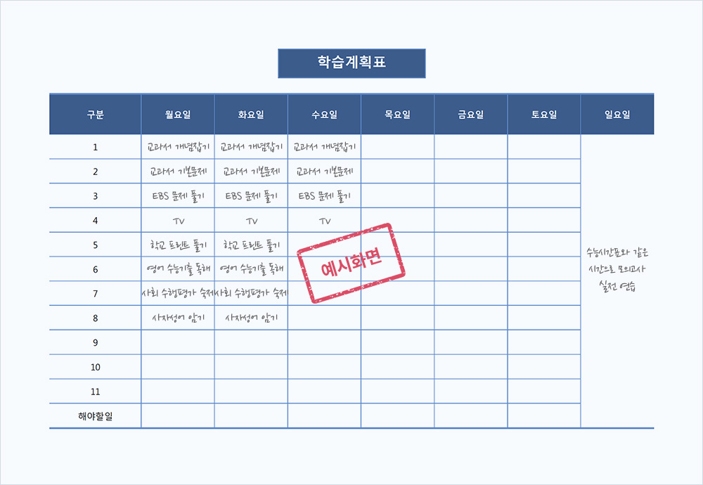½ÃÇè°èȹǥ ÀÛ¼º½Ã °¡Àå ¸ÕÀú ÇØ¾ß ÇÒ ÀÏÀº °øºÎ ´ë»óÀ» Á¤ÇÏ´Â °ÍÀÔ´Ï´Ù. ±¸Ã¼ÀûÀ¸·Î ¾î¶² °ú¸ñÀÇ ¾î¶² ±³À縦 »ç¿ëÇÒ °ÍÀÎÁö¸¦ °ú¸ñº°·Î ¹Ì¸® Á¤¸®ÇÕ´Ï´Ù. ¾ÆÁ÷ ½ÃÇè ¹üÀ§°¡ ³ª¿ÀÁö ¾Ê¾Ò´Ù¸é °¢°¢ÀÇ ±³Àç¿¡¼ °øºÎÇØ¾ß ÇÒ ¹üÀ§¸¦ ³ª¶õÈ÷ ±âÀçÇÕ´Ï´Ù. ÀÛ¼º¹æ¹ýÀº ½Ã°£°ü¸® Ç¥¸¦ Âü°íÇØ¼ °ú¸ñº°·Î ´Ü¿ø³»¿ëÀ» ÇÑ ½Ã°£ ´ÜÀ§·Î ³ª´¯´Ï´Ù. ½Ã°£´ç °øºÎÇÒ ³»¿ëÀÌ Á¤ÇØÁö¸é ³¯Â¥ º°·Î È®º¸ °¡´ÉÇÑ °øºÎ½Ã°£À» °¨¾ÈÇÏ¿© ÁÖ¿ä°ú¸ñ À§ÁÖ·Î ÀûÀýÈ÷ ¹èºÐÇϰí, ÃÖ´ëÇÑ ±¸Ã¼ÀûÀ¸·Î ¹üÀ§¸¦ ¼¼ºÐÇÏ¿© Àû¾î¾ß ÇÕ´Ï´Ù. ±×¸®°í ÁÖÀÇÇØ¾ß ÇÒ Á¡Àº ¹Ýµå½Ã 3ÀÏ Á¤µµ ÀÌ»ó Review½Ã°£À» °¡Á®¾ß ÇÑ´Ù´Â °ÍÀÔ´Ï´Ù.